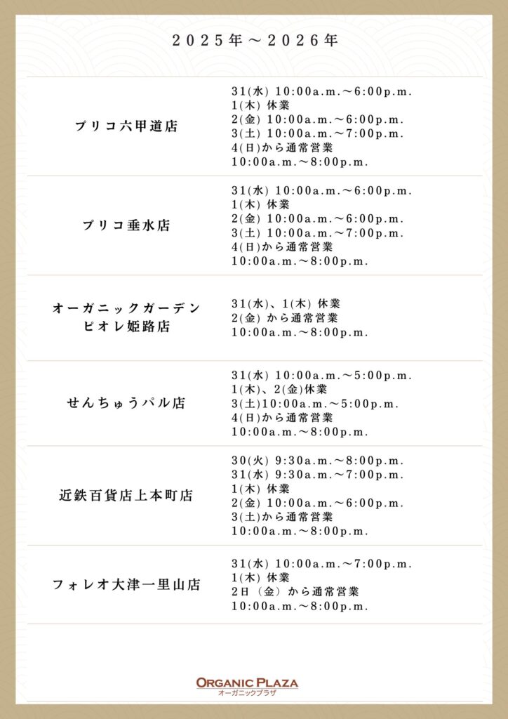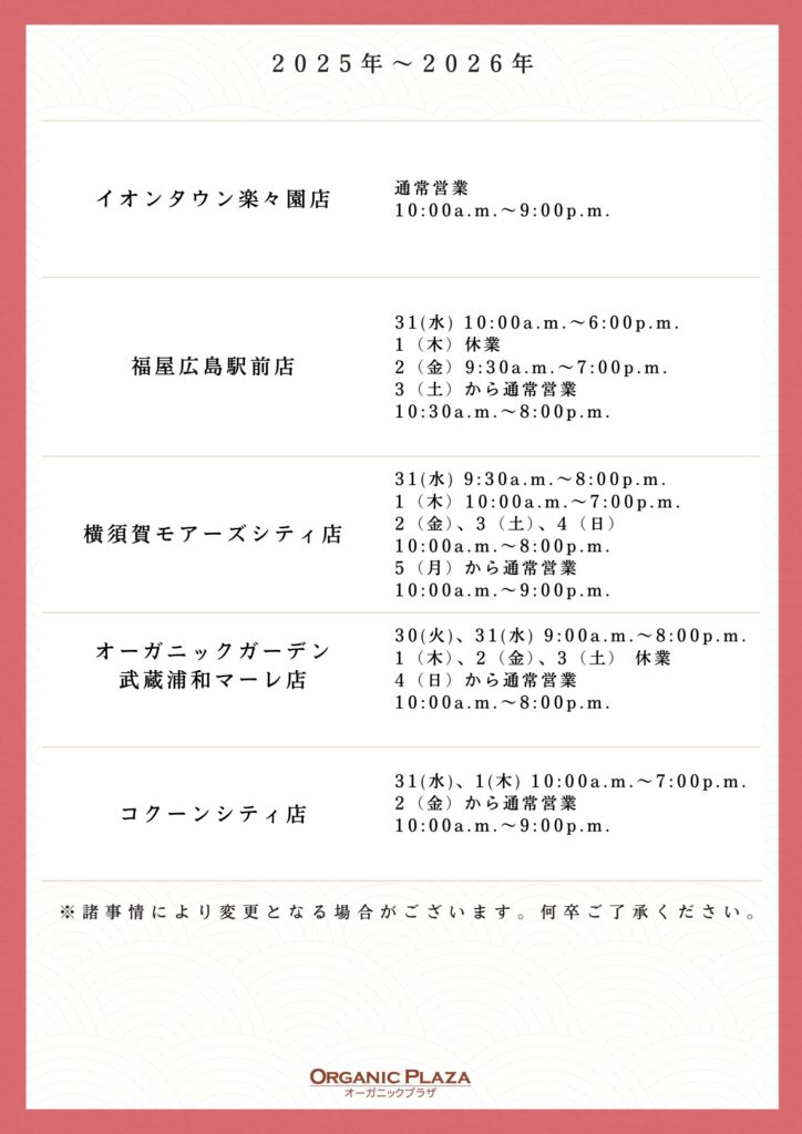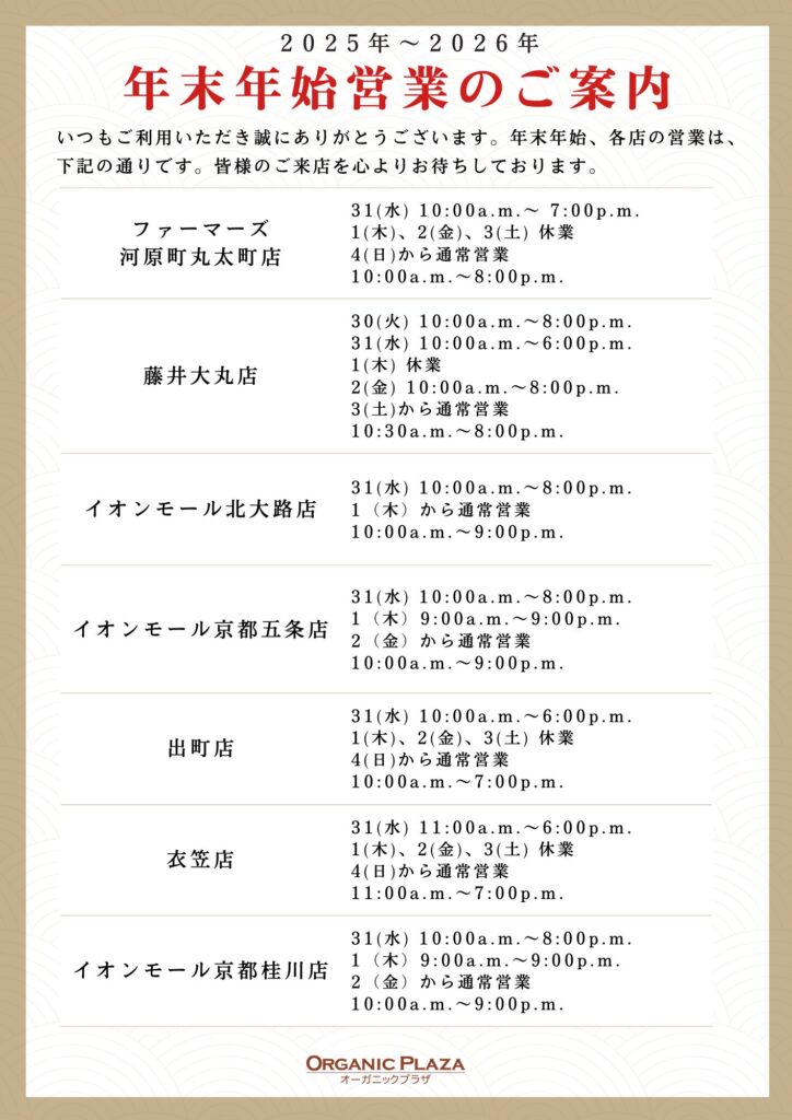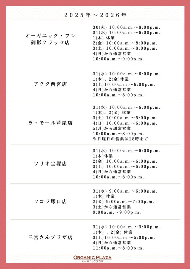 年末年始の営業について 投稿日 2025/12/01 更新日 2025/12/06 著者 オーガニックプラザ カテゴリー お知らせ いつもご利用いただき誠にありがとうございます。年末年始のお買い物もぜひ当店へお越しください、皆様のご来店を心よりお待ちしております。