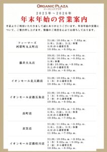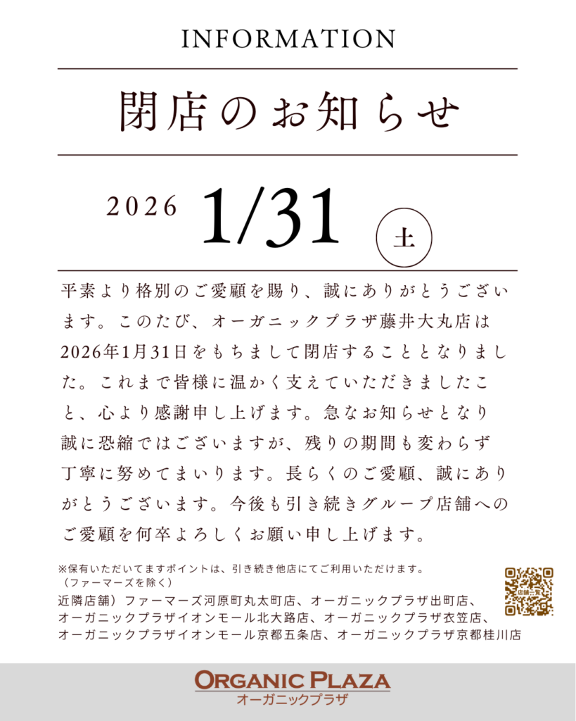 この度、オーガニックプラザ藤井大丸店は2026年1月31日(土)をもちまして閉店させていただく事となりました。ご利用のお客様にご不便をおかけいたしますことをお詫び申し上げますとともに、これまでのご愛顧に心より感謝申し上げます。引き続き近隣店舗にてオーガニックプラザをご愛顧いただけますと幸いです。これまでのご愛顧に感謝を込めて1月2日(金)よりセールを実施いたします。最終日となる1月31日 までの間、お近くにお立寄の際はぜひご来店ください。なお、ポイントシステムは、閉店後もオーガニックプラザ各店(ファーマーズ河原町店及び近鉄百貨店上本町店を除く)にてご利用いただけます。よろしくお願い申し上げます。